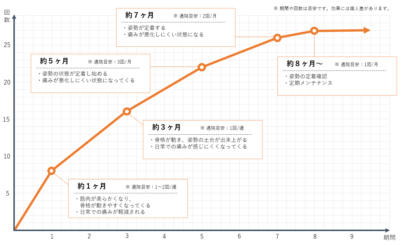 ただし、長年の悪い姿勢習慣がある方・ゆがみが強い方の場合は、半年~1年以上かかることもあります。